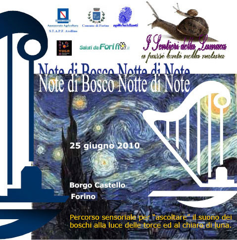 La manifestazione “Note di bosco, notte di note“, si terrà il giorno 25 giugno 2010 nella frazione Castello di Forino a partire dalle ore 20.30.